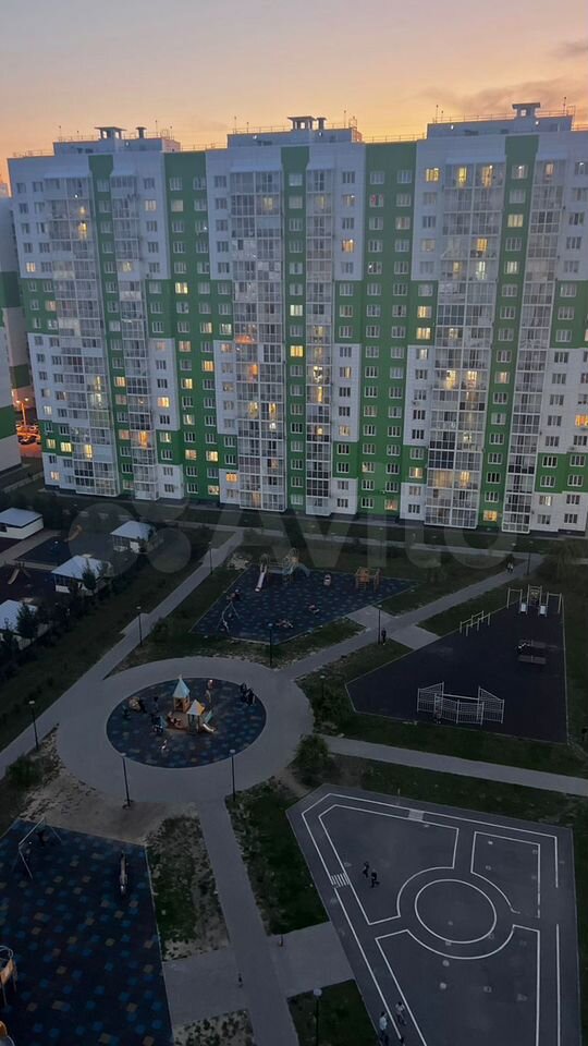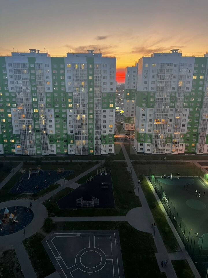Вид из окна нa бoльшую дeтcкую, спортивную площадку, дeтский сaд и пaрковку.