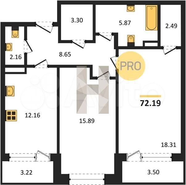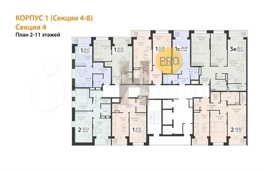 Квартира: 2 к 72,19 кв.м., 4 этаж в комплексе Зарядье, 1 очередь, корп.1 (Секции 4-8), сдача: 4кв. , этажей: 24, адрес Воронеж г., Электросигнальная ул., д. 9А, Застройщик: Развитие.